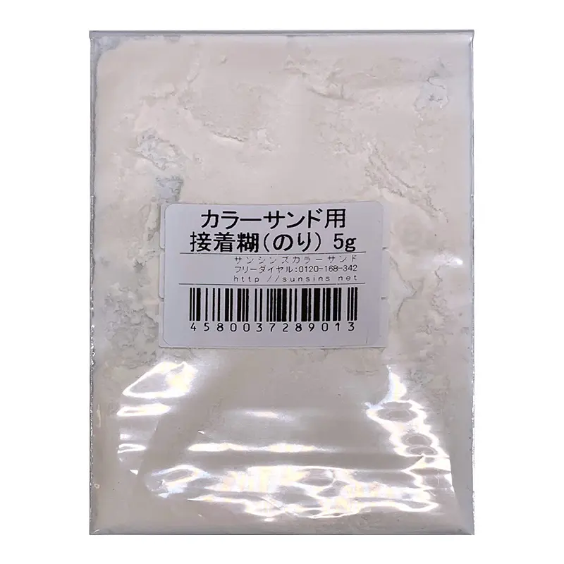 糊の粉は白色ですが、水に溶かすと透明になり、その後乾燥させても白い粉には戻りませんので、カラーサンドの色を変えることなくご使用頂けます。