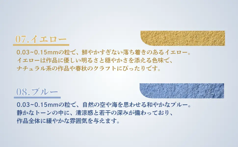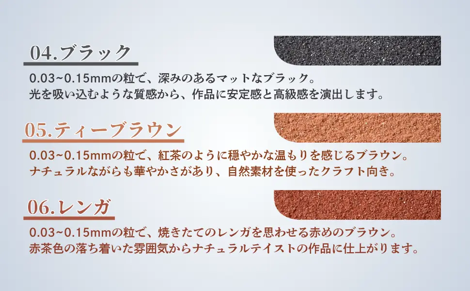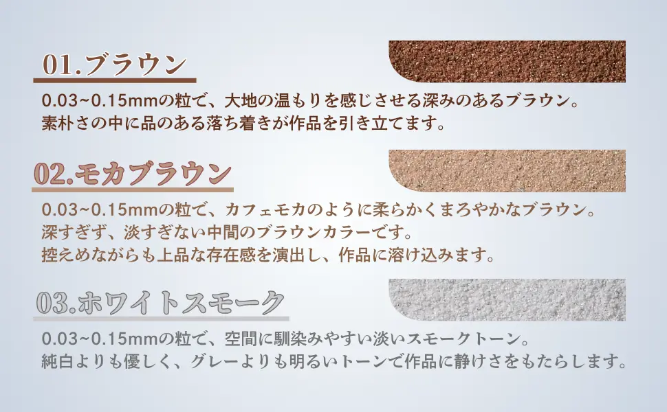 - 粒子の大きさによって見た目の量に差があり、細かい粒子の方が多くなります。