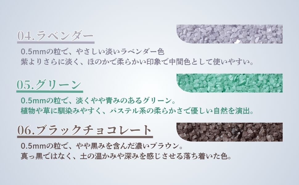- 粒子の大きさによって見た目の量に差があり、細かい粒子の方が多くなります。
